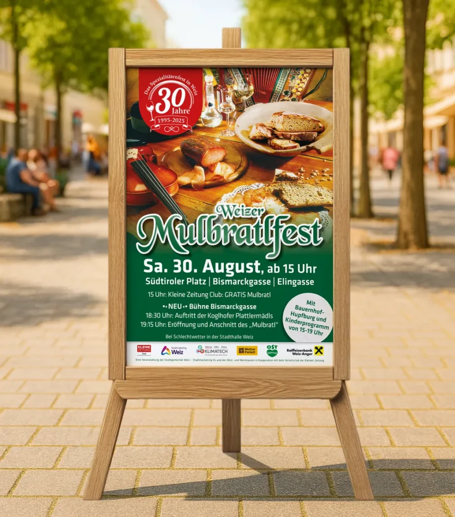 Zum 30-jährigen Jubiläum des Weizer Mulbratlfests gestalteten wir wieder ein traditionsverbundenes Erscheinungsbild. Das Plakat kombiniert Motive wie Brot, Speck und Ziehharmonika mit klarer Typografie und kräftigen Farben – typisch steirisch und einladend.